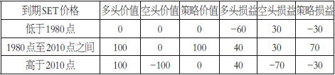 与普通期权一样,二元期权同样可以构建区间交易的策略。当投资者预计标普500指数将保持在1980点到2010点区间内时,可以买入执行价格为1980的看涨BSZ合约,同时卖出执行价格为2010的看涨BSZ合约。假设此时1980看涨合约报价为0.6,2010看涨合约的报价为0.3,那么在不考虑交易费用的情况下,此时成本价为30美元((-0.6+0.3)×100),到期将出现以下三种情况: