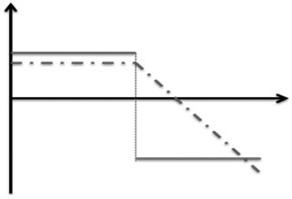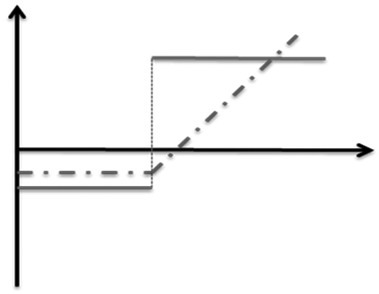 同样,当预计标的资产价格将下降时,可以采取熊市策略。例如,当前VIX指数为13时,如果投资者感觉当前指数过高,将在未来一个月内保持在13以下时,可卖出执行价为13的下月看涨BVZ合约,假设当前该合约报价为0.6,那么卖出合约的收益为60美元,此时需要交纳40美元的保证金。若到期VRO低于13,投资者将保留60美元的收益,而如果到期VRO高于13,投资者将付出100美元。该策略与普通期权的到期损益图如下,同样可以看出,当指数上行时,投资二元期权的损失将远高于投资普通期权。