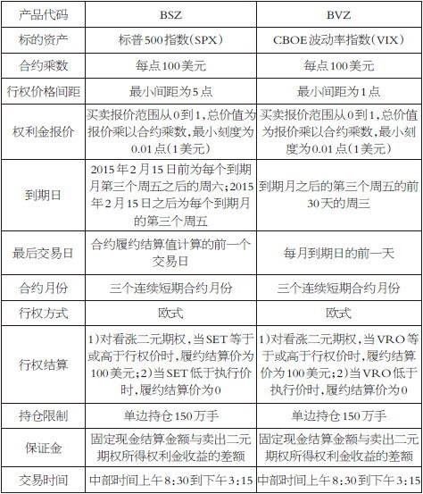 场内二元期权与场外二元期权有一定区别,场内二元期权与普通期权相似性更大。以CBOE为例,当前CBOE交易两个二元期权品种:以标普500指数(SPX)为标的的二元期权和以波动率指数(VIX)为标的的二元期权。
