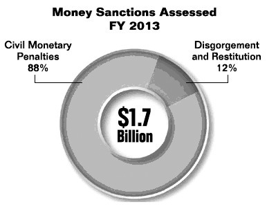 同时,CFTC对于违法行为的处罚愈加严厉,2013年度的罚款金额达到了空前的17亿美元,相当于2012年的三倍之多。其中民事罚款15亿美元(当中10亿美元为对操纵LIBOR的三大金融机构的罚款),而赔偿投资者损失和追缴的罚款总额亦超过了2亿美元。