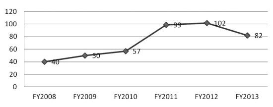 金融危机之后,美国期货市场成交量总体仍呈稳步上升态势,芝商所2013年成交量为31.6亿手,较上一年度增加9.2%。与之对应的是各类违规行为也在快速发展。近年来,CFTC强化了对价格操纵、市场欺诈等违法违规行为的执法力度。2013年CFTC执法部门共审理82起违法案件,并对290起违规行为立案调查,数量较前一年分别减少20%和17%。值得注意的是,尽管从单个年度来看案件数量是下降的,但2011、2012、2013三个年度处理的违规案件数量之和几乎达到之前三个年度(2008、2009、2010)案件总数的两倍。这说明从长期趋势来看,案件数量依旧呈上行态势。
