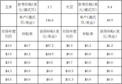 举例说明,假设某郡的PLC标准是2008—2012年补贴单产:玉米146.6蒲式耳/英亩,大豆48.9蒲式耳/英亩;参考价格为:玉米3.7美元/蒲式耳,大豆8.4美元/蒲式耳。市场年度均价、补贴率计算过程为: