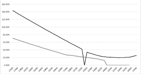 当执行看涨(或看跌)价差策略时,你要寻找资产价格上升(或下跌)、但是隐含波动率有下降趋势的资产。如图4,很明显买看跌期权价差是不可取的,但是看涨价差是可取的,因为当资产价格上升时,隐含波动率看起来更低一点。