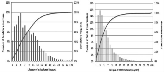 对冲基金通常的生命周期是多长时间呢?我们从Eurekahedge上统计了16452只对冲基金的数据,其中有4780家已关闭,11528家正在活跃,通过对其生命跨度的研究能看到以下两个特点: