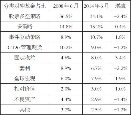根据我们对Eurekahedge上对冲基金数据进行的汇总可以发现,2014年6月,有34.1%的对冲基金是以股票多空仓为主,其次是多策略交易占15.2%,第三位是事件驱动型基金,而期货市场比较熟知的CTA策略或管理期货基金占比约9%。自2008年以来,对冲基金的分策略占比基本上保持稳定。