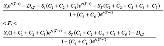 股指期货套利的关键在于对套利边界的确定,依据持有成本理论,再将税收、交易成本等因素考虑进来,可以得到股指期货均衡价格的区间。略去复杂的公式推导,得到股指期货的无套利区间公式为: