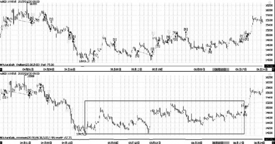 图为PSY在振荡行情中的过滤器效果,上图为MACD,下图为MACD+PSY