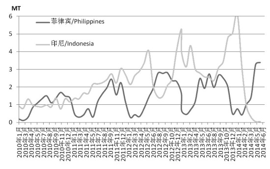 “禁矿令”颁布后,中国增加了从斐济、牙买加、巴西和几内亚等国的铝土矿进口。目前,镍产量占世界总产量9%的菲律宾——也是中国在亚洲地区唯一的高品位红土镍矿来源,接棒印尼,大量出口镍矿,稳定了镍市场供应。随着未来新的镍矿进口渠道的拓展以及其他镍出口国对中国出口量的增加,镍资源的阶段性紧张将得到缓解。2014年上半年菲金属矿产品产值达到572.7亿比索,同比增长22%。其中,镍矿为310.3亿比索,占总产值的54.2%,同比增长59%。