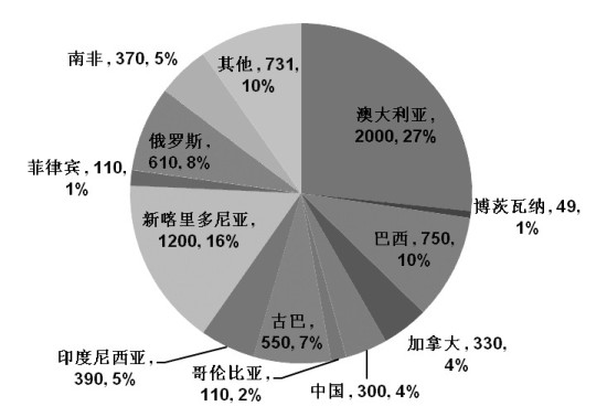 世界上的红土镍矿主要分布在南北回归线范围内的两个区域:大洋洲的新喀里多尼亚、澳大利亚东部,向北延至东南亚的印度尼西亚和菲律宾;中美洲的加勒比海地区。大多数具有工业意义的红土型镍矿床均发育于橄榄岩基岩之上,是在热带或亚热带地区经过大规模的长期化学风化,由铁、铝、硅等含水氧化物组成的疏松黏土状矿石。澳大利亚镍金属储量和基础储量都居世界首位,分别为2600万吨和2900万吨,各占全球总量的37.8%和19.6%。澳大利亚、新喀里多尼亚、俄罗斯、古巴、加拿大、巴西、南非、印尼占全球总镍金属储量的89.5%,总镍基础储量的84.1%。我国的镍资源处于相对紧张状况,对进口资源的依赖程度较高。