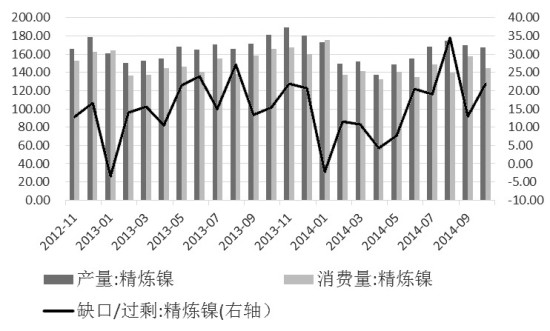 在对镍资源紧张的担忧之中,全球镍市场供需平衡仍然处于微妙状态。世界金属统计局(WBMS)报告显示,2014年全球镍市场供给过剩19.7万吨,LME镍库存年增15.3万吨。2014年全球镍市场表观需求量年减9.22万吨。伦敦金属市场的镍价也走出5年新低,揭示了此前市场对紧张担忧的不必要。
