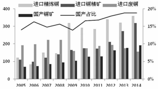 图为中国铜市场进口、国产情况(单位:万吨)