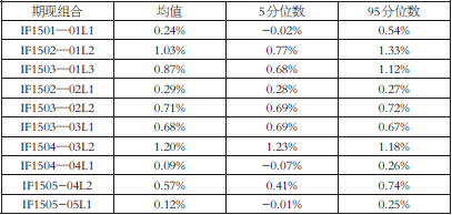 从2015年已经交割完毕的合约与过去两年同期历史基差的比较结果来看,2015年各期现组合的基差均值均高于历史同期,套利介入空间明显。其中,IF1502—01L2、IF1504—03L2的基差均值超过了1%,这意味着期现套利者选择下月合约介入,优势高于当月合约。95分位数可视为期现套利者可以获得大幅基差收益的进场点位,与历史高点相比,IF1502—01L2、IF1503—01L3、IF1504—03L2的基差95分位数超过了1%,这从侧面反馈出套利者在2015年斩获大幅基差的可能性,要高于前两年。