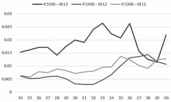 对比IF1502—01L2的基差与历史同期基差的历史数据,可以发现基差日均值明显高于历史同期。另外,随着剩余存续期限不断降低,基差也呈现逐渐降低的趋势。当剩余期限处于24天至40天的区间内,基差日均值从高点回落1%,IF1502—01L2经历了10个交易日,IF1402—01L2经历了7个交易日,IF1303—01L2未曾出现从高点回落1%的情况。IF1502—01L2基差均值回复1%,经历了较长的时间,这可能与股指期货参与者选择多头介入的意愿较强有关。