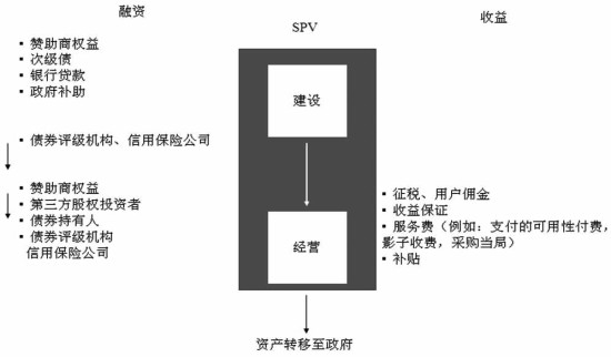 虽然不同模式下,公共部门和私营部门承担的责任和义务、收益和风险以及项目的持续时间都不相同,但是结构上可以有类似的形式。首先,由政府部门和私人部门等项目发起人成立特殊目的的公司(SPV);然后由SPV负责建设和实施,其中所需要的资金由SPV负责融资,其中资金来源主要有发起人的资本、银行贷款、政府担保以及债券等形式;其次,项目建成后在政府授权下,由SPV继续负责运行,运行所需的资金主要来自发起人的资金、债券持有人、第三方投资者等,运行中的收入主要包括公共产品使用者的费用、服务费用、政府的保证费用等;最后,项目结束后,SPV将公共产品移交给政府。
