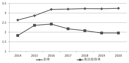 图为2015—2020年发达经济体与全球实际GDP同比增速预测