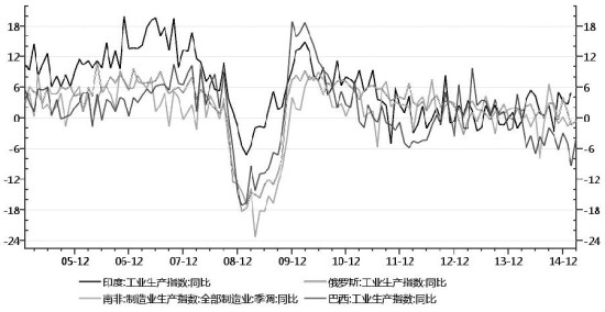图为2005—2015年俄罗斯、印度、南非、巴西工业生产指数同比(%)