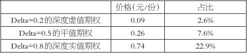 由上表可知,深度虚值期权购入成本很低,当上证50ETF期权为3.4元/份时,1手Delta值为0.2的两个月期上证50ETF认沽期权仅为0.09元/份(900元/手),占现货价格的2.6%。同等条件下,平值期权权利金占现货价格的7.6%。Delta值为0.8的深度实值期权占现货价格的22.9%。