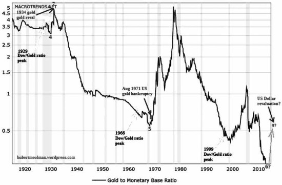 综上所述,我们看到了上世纪30年代和70年代发生了类似情况的两个阶段。先是经历道琼斯指数与黄金比例的高点,然后就会出现一个时期的黄金需求短暂猛增,从而导致美元重新调整。从1999年至今,其实也跟上述两个阶段十分相似。图2第3点出现了道琼斯指数与黄金比例的高点,从这点之后,图表走势有如上世纪30年代与70年代,但比当时更为剧烈。接下来,很可能会有一个黄金需求猛增的阶段,然后导致通缩压力出现。这跟上世纪30年代与70年代出现的美元赎回压力是一样的。我们将会看到图2上点6所示,随后黄金与货币基础的比例就会大幅拉升,推动黄金价格明显上升。