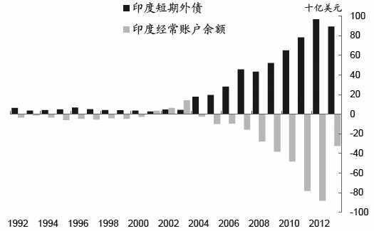 而大规模石油和黄金进口导致持续赤字。由于连续多年维持贸易赤字(即经常账户赤字),2007年以来印度外债不断累积。2013年外债总额已经高达4400亿美元,约为GDP的22%(中国为9%),占印度外汇储备的比重超过150%(中国为23%)。印度外债结构(如币种构成、利息占比、占GDP/外汇储备比重),与其他主要新兴经济体类似,但短期外债占总外债的比重高于大多数新兴市场国家。过去几年,印度外债的另一个重要变化是短期外债占比显著上升,到2013年该比重已经超过20%,接近1989年有数据以来的最高水平。