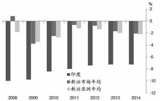 二是印度财政赤字、贸易赤字和巨额外债使得财政政策发挥空间有限。与大多数新兴经济体不同,印度长期维持大规模财政赤字。根据IMF 的统计,2014年印度财政赤字占GDP的比重高达7.2%,显著高于新兴市场2%的平均水平。