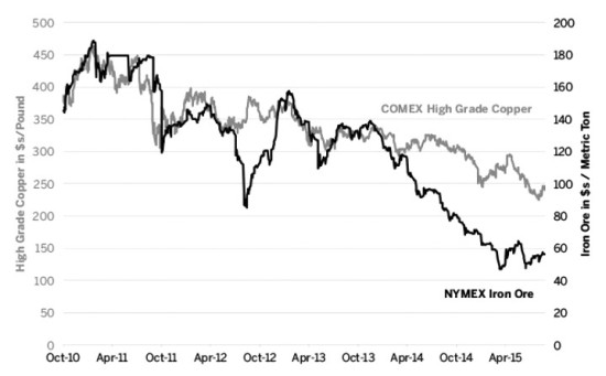 事实上,自从2015年4月以来,铁矿石价格并没有进一步下降,这可能暗示其价格已经完全反映中国经济增速放缓。若如此,铁矿石可以被视为其他大宗商品的领先指标——自今年4月以来由于受到中国和其他新兴市场国家经济增长速度放缓可能性的影响,众多大宗商品价格均纷纷出现大幅跌落。