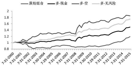 策略方面,我们根据绝对动量的符号对比三种动量策略,当绝对动量为正时持有该资产,而当绝对动量为负时,则作如下处理:不作任何投资,持有现金;以无风险利率进行投资;做空该资产。