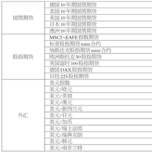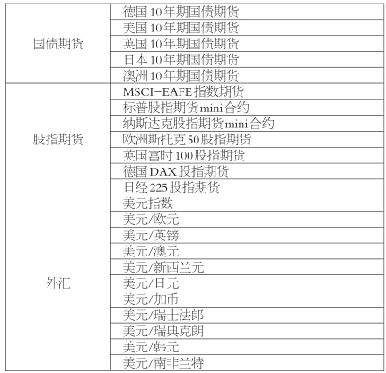 样本方面,我们使用2000年7月至2015年7月的收盘价数据,对全球主要发达国家的股指期货、国债期货及较活跃货币对构建投资组合。同时将下列23种资产等权重配置作为基准来考察绝对动量收益,无风险利率将使用同期限美国国债收益率作为替代。