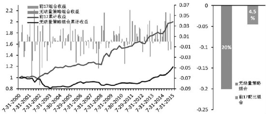 结果发现,在形成期与持有期均为三个月时,该组合获得较高的收益及夏普比率。而从组合配比的角度进一步细化时发现,传统配比方法及简单加权动量方法表现相近,均不及排序动量配比法有效。对比初始被动持有策略,该动量方法在标准差不变的情况下,年化收益从1%提高到4.7%,偏度的提高显示出更稳定的盈利能力,最大回撤亦从20%降低到4.5%。买入过去相对较好表现的资产,卖出过去相对表现较差的资产仍能获得较为出色的表现。