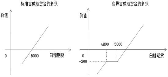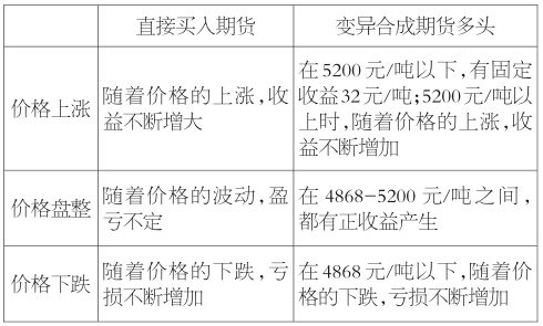 由上图可知,从投资效果上看,标准合成期货多头头寸的盈亏状态和直接买入期货合约一致。而变异合成期货多头则在4800—5000元/吨价格之间损益固定,即形成价格缓冲带,这也是变异合成期货头寸的损益特点,它的出现为合成期货提供了用武之地。