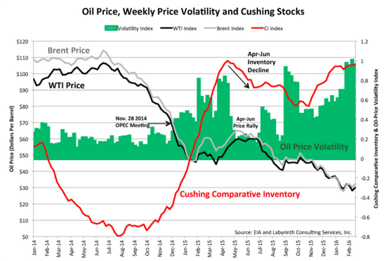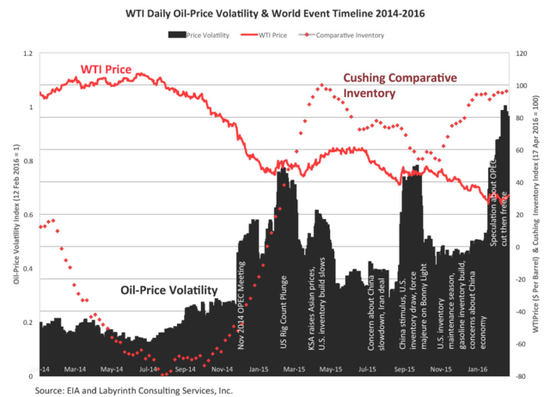 Oilprice制作了一张关于WTI日均油价波动性、库欣地区可比较库存、全球主要基本面事件的时间线: