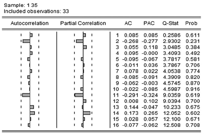 图3中最后两列用于X2检验,该残差序列样本量为33,最大滞后期m可以取[33/10]或[
