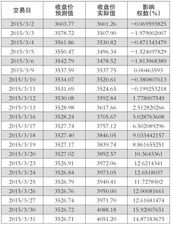 表4中的影响权数=(收盘价实际值-收盘价预测值)/收盘价预测值×100%,表示全国两会在第i日的累积影响程度,代表全国两会每天对序列产生的干预效应。