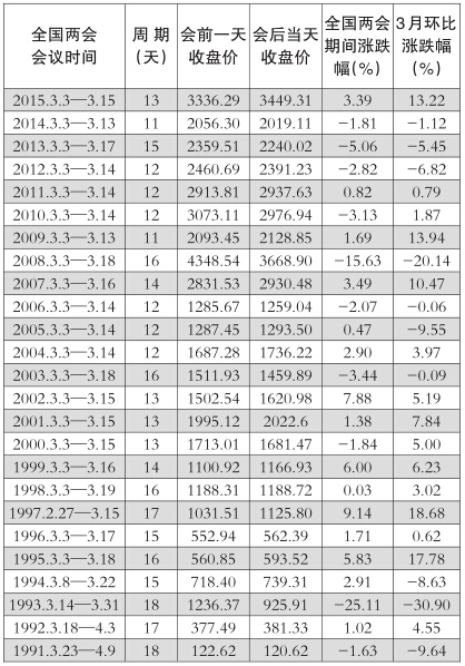 表1为历次全国两会期间上证指数表现情况