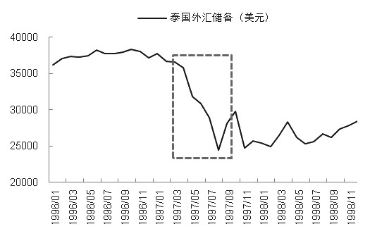 国际投机资本乘虚而入,泰铢陷入崩溃,东南亚系列货币失守,触发亚洲金融危机。1997年2月,泰国出现了第一次泰铢贬值风波,泰国中央银行运用20亿美元外汇储备干预外汇市场,平息了此次风波。但好景不长,5月国际金融市场再次盛传泰铢贬值,引发泰铢汇率大幅波动,泰国央行通过“东亚中央银行总裁会议”的会员国联合干预外汇市场,以百亿美元代价维持汇率,但由于泰铢贬值压力进一步增加,外汇市场出现恐慌性抛售,泰国央行多次干预后外汇储备大幅下滑,最终泰国政府于7月2日被迫宣布放弃联系汇率制度,泰铢当日暴跌。