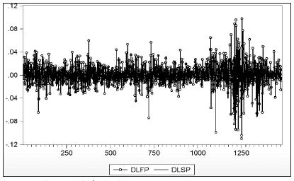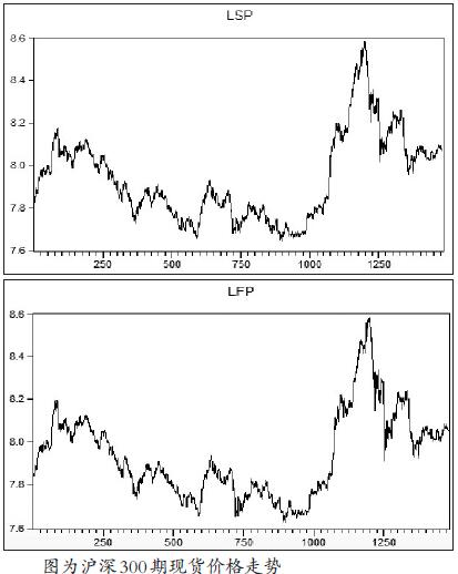 在实证分析中,本文以风险最小化为假设前提,想要研究最优套期保值比率,就是研究在最小方差模型下,得到的最优套期保值比率。本文以沪深300指数和沪深300股指期货为样本,选取2010年7月1日至2016年9月30日的日交易数据。其中,沪深300指数用St表示,沪深300股指期货用Ft表示。为减少异方差性,我们首先对St、Ft采用对数平滑法来处理数据,记作lnSt、lnFt,然后将处理之后的数据导入到Eviews软件中,得到了下图所示的价格走势: