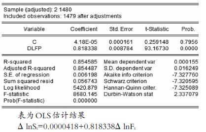 将沪深300指数和沪深300股指期货的日收益率序列带入到模型中,使用OLS法对模型进行回归分析,结果如下:
