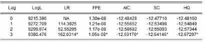 至于残差自相关的问题,这是OLS模型不能解决的,而VAR模型解决这个问题则很简单,只要选取最优滞后阶数(p、q)就可以了。在做模型估计之前,首先需要确定变量的最优滞后阶数,Eviews软件的输出结果如下: