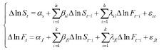 上式中,αs、αf是截距项,βsi、λsi、βfi、λfi是回归系数,ΔlnSt-i是在t-i时现货价格的对数收益率,ΔlnFt-i是在t-i时期货价格的对数收益率,εst、εft是独立分布的随机误差项,k是滞后期。我们可以通过VAR模型寻找最佳滞后期,当寻找到最佳滞后期之后,就可以消除残差的自相关,得到最优套期保值比率,公式如下: