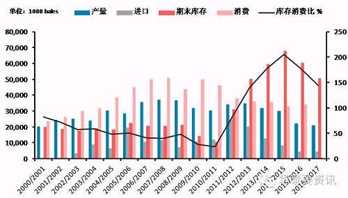 近几年全球棉花产量在2100-2200万吨左右,消费则在2400万吨——全球棉花进入去库存阶段。