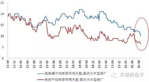 图:钢厂焦煤和焦炭的剩余库存天数都处于历史低位,尤其焦煤,不断刷新低