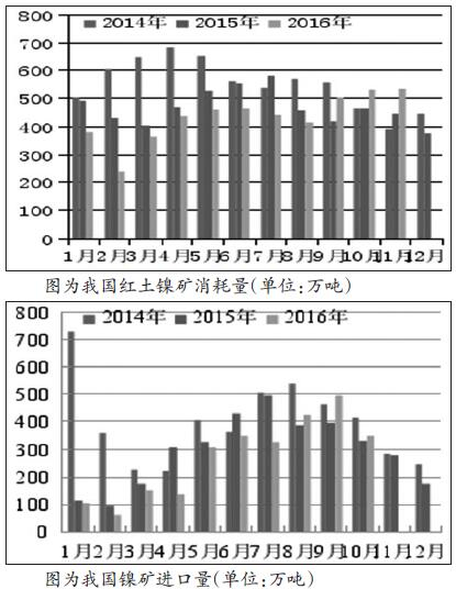我国镍矿比较缺乏,对外依存度高,达到60%以上。下面用镍矿进口量/国内耗矿量来计算我国对红土镍矿的对外依存度。数据显示,2014年、2015年我国镍矿进口量分别达到4770万、3500万吨,红土镍矿耗镍量达到6633万吨和5634万吨,对外依存度分别达到71.95%和62.42%。2016年1—10月我国镍矿进口量达到2714万吨,耗镍量达到4249万吨,占比63.88%。