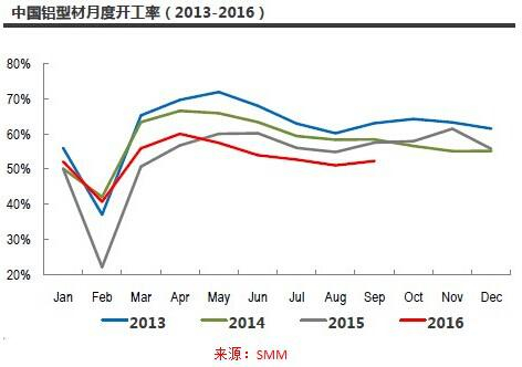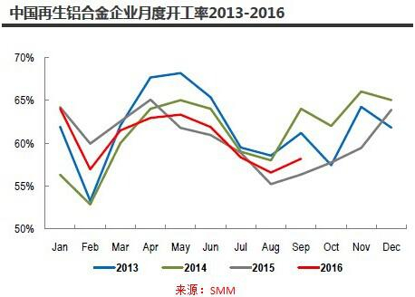 4、再生铝合金:国内再生铝合金企业产能提升,产能趋于过剩,虽然汽车需求保持旺盛,但摩托车等相关压铸零配件市场需求降低,2016年前三季度再生铝合金企业月度平均开工率同比降低1个百分点至60%。