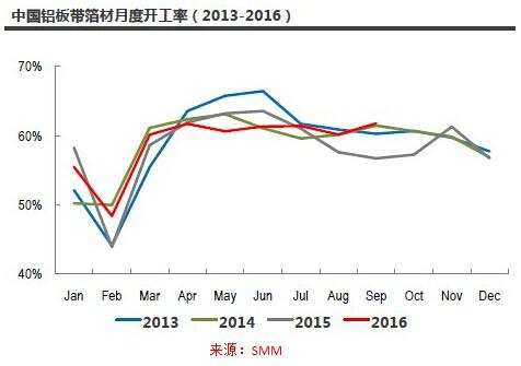 1、铝板带箔:受建筑幕墙板、新能源汽车电池壳、3C材料、新增火电站散热材料以及国内铝箔出口需求拉动,2016年前三季度,铝板带箔企业月度平均开工率同比增加0.7个百分点。