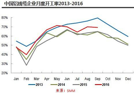 3、铝线缆:2016年由于国内特高压电网建设集中,前三季度国内铝线缆企业月度平均开工率同比提升6.4个百分点至61.6%。