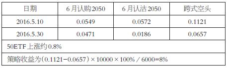 二是市场价格长期窄幅波动,无法辨明后市方向,但预计将发生大幅涨跌时入场。当技术分析面临较大的不确定时,也可以采用买入跨式策略。如去年5月6日和7日股市连续两天破位下跌,使得投资者人心涣散,随后的15个交易日都在箱体内小幅振荡盘整。增量资金入市犹豫,成交量明显趋于萎缩,并且连续出现地量。投资热点平淡,投资者观望情绪浓厚。一系列特征都显示市场正在筑底修复,可能迎来大涨,但不排除会出现4月底的“盘久必跌”行情。由于波动率持续下跌,期权价格相对便宜,可以择机买入跨式。50ETF在5月31日放量向上突破大涨3.4%,6月平值认购期权大涨逾300%,6月虚值认购期权则大涨逾500%。而认沽期权下跌最多的合约仅下跌60%,跨式策略获利丰厚。例如,5月25日买入6月2050跨式,截至5月31日收盘时策略收益如下表(不考虑手续费):