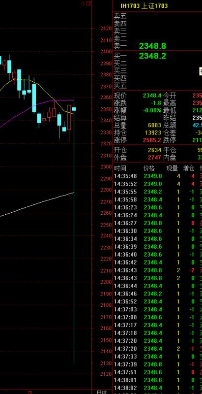 新浪财经讯 3月14日消息,上证50期指主力合约IH1703盘中出现乌龙指,最低报价2128.6,逼近跌停,1分钟内成交了200多手。本周五股指期货3月合约即将交割。