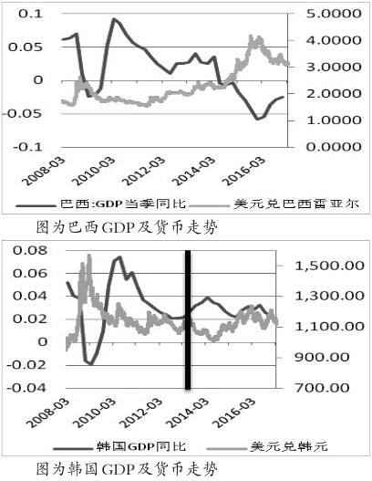 另一方面,在美元大幅拉升的情况下,非美货币均遭遇大幅下跌,新兴市场受创尤为突出。2014年,大部分新兴市场国家经济增长形势遭到逆转,由上升转为急速下降。巴西经济增长急转直下,GDP同比增速在年中转为负增长,货币雷亚尔大幅下跌近23%;新加坡GDP同比增长由5.5%滑落至3%以下,新加坡元贬值近7%;韩国GDP同比增长由3.9%下降到2.7%,韩元贬值近10%。