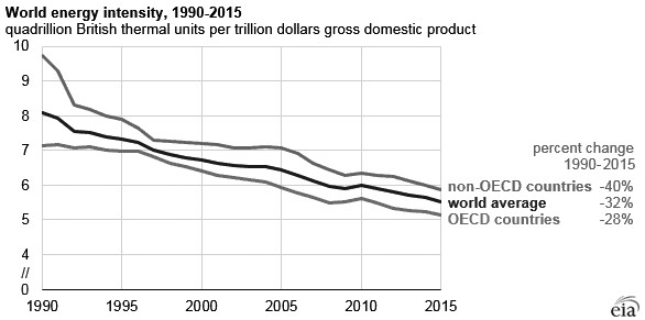 测量能源强度通常要参考一个国家单位GDP的初级能源的供应。初级能源供应是指一个国家以原始形式产生的所有能源,如原油、煤、水力、原始天然气等。初级能源供应再转化为我们使用的燃料(原油与汽油、煤与电等),因此包括用于从一种形式转换为另一种形式(例如在发电中)的能量。它还反映了能源生产,包括供应给出口市场的能源,但不包括从其他国家进口的能源。世界能源强度在1990年至2015年期间下降了近三分之一,全球几乎所有区域的能源强度都有所下降。