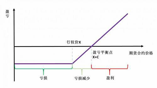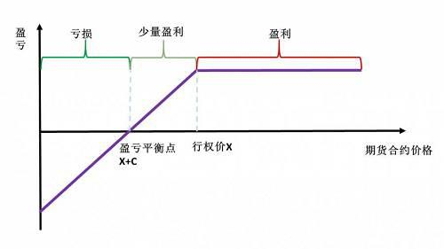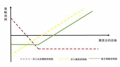 这种策略的最大损失是支付的期权权利金+(行权价格-期货买入价格);最大收益是无限的,盈亏平衡点,即期货买入价格+期权权利金。