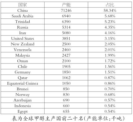 产能排名前十的主产国分别为中国、沙特、特立尼达和多巴哥、俄罗斯、伊朗、美国、新西兰、委内瑞拉、马来西亚和阿曼,这些国家的甲醇产能占全球总产能的97%。